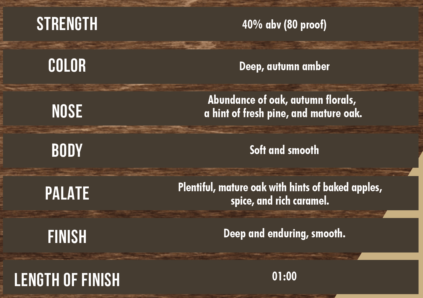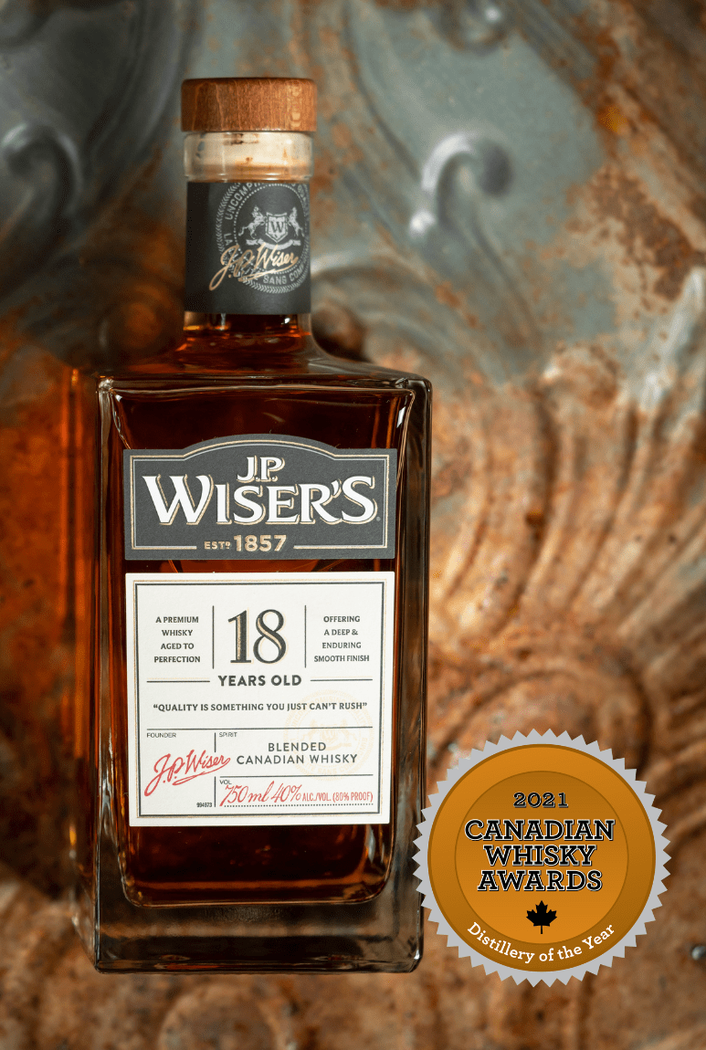 J.P. Wiser’s 18 Year Old is a beautiful blend of 100% soft double column distilled corn whisky, aged in used Canadian whisky casks, which emphasizes grain and yeast characteristics, such as mature oak, autumn florals, spice and rich caramel.