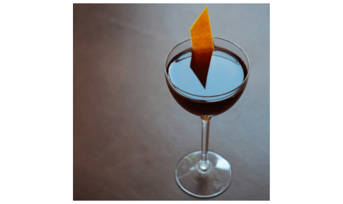 Method: Combine all ingredients in mixing glass, add ice so mixing glass is ¾ full and stir about 18 to 20 times. Strain up in a chilled glass. Squeeze zest across the drink to release the oils, give it a twist and use as garnish.