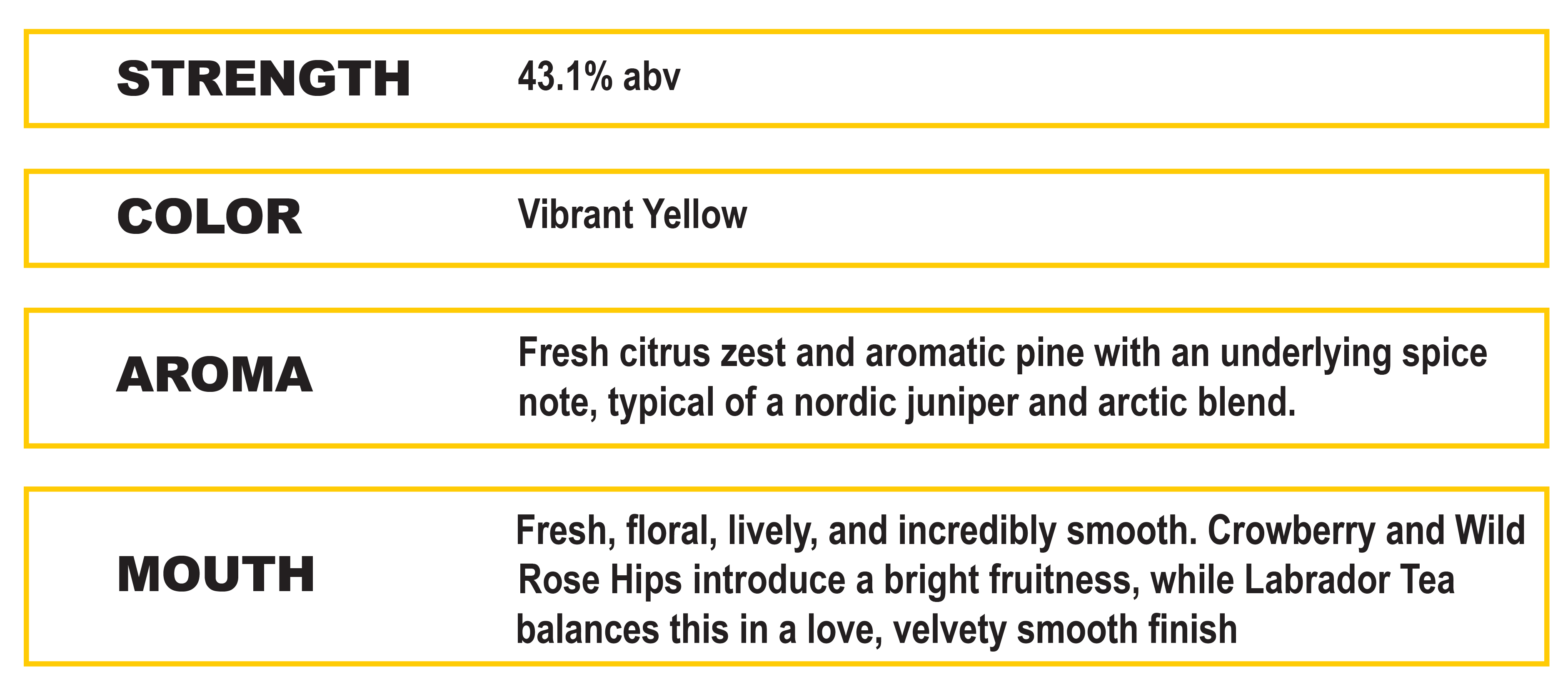 First, an initial distillation using spirit with several of the botanicals - Juniper, angelic seed, coriander, lemon, and orange peel - to make a base gin. Then a secondary five-week steeping process with the arctic botanicals in neutral grain spirit. Both are blended together to create a savory and robust flavor and color in the finished product. It is bottled at 43.1 % abv.